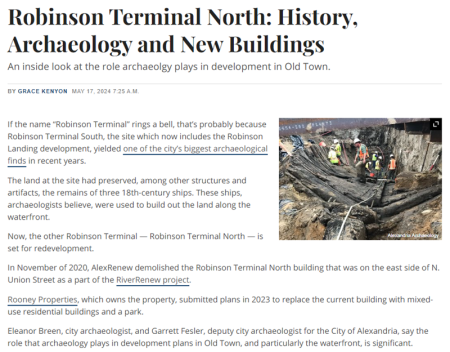 Robinson Terminal North: History, Archaeology and New Buildings: An inside look at the role archaeology plays in development in Old Town. by Grace Kenyon, Alexandria Living, May 17, 2024.