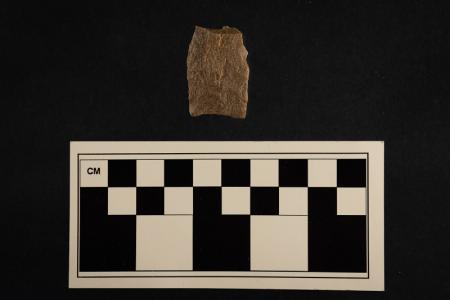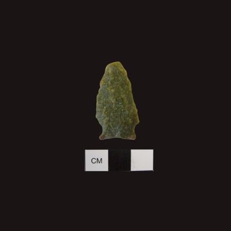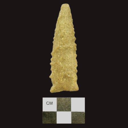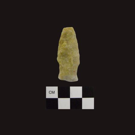 Only the base of this point remains. Breaks like this are common and make identification difficult. Other artifacts found in the same place can help with identification, but this one was found alone. Analyzing the length, width, thickness, and other characteristics suggests that this is a Clovis point. Clovis points are identified by the shape of the base, blade, and flute of the channel.