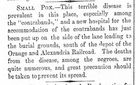 Local newspaper article describes the impact of smallpox in Alexandria, “especially among the ’contraband.’”