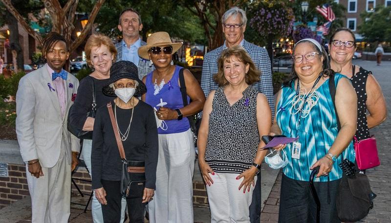From August 6-9, 2021, Alexandria City Hall and the Carlyle House (shown here) and the George Washington Masonic Memorial are illuminated in purple, the color of morning.