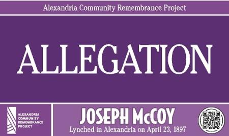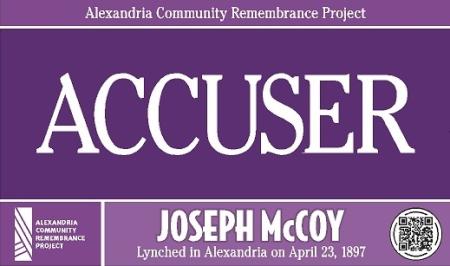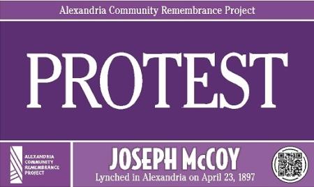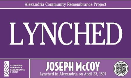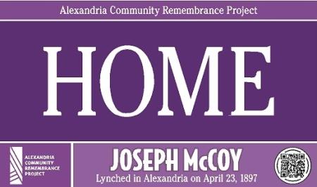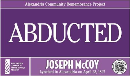 The Alexandria Community Remembrance Project marked the places in this city that were important to the story of the life and death of Joseph McCoy, an 18-year-old native Alexandrian accused of a crime and killed by a mob on April 23, 1897. The purple signs alerted passersby to Joseph McCoy’s existence and the role his life and death played in our shared history.