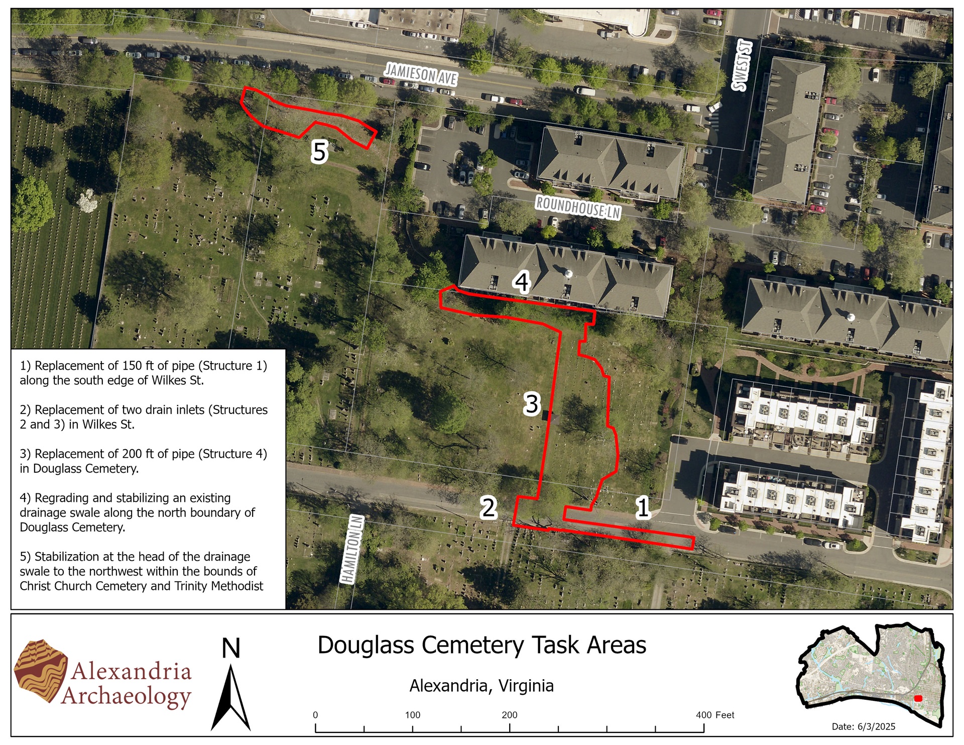 2025 June, Stormwater Project Update: The City of Alexandria is implementing a stormwater infrastructure project at historic Douglass Cemetery. The construction is anticipated to begin in the fall of 2025. A new stormwater pipe and inlets will be installed within the Wilkes Street right of way in the coming months. During that work, there will be a brief disruption of traffic on Wilkes Street between Douglass and Bethel Cemetery. A maintenance of traffic plan (an MOT) will be developed by the construction contractors, which will shared in advance of the work. During this disruption, pedestrian and vehicular traffic on Wilkes Street in this area will be impacted and limited. This map shows where the pipe and inlets will be replaced in the project area in Wilkes Street, in addition to other project components. More information will be provided once the timeline and duration of the closure on Wilkes is scheduled.