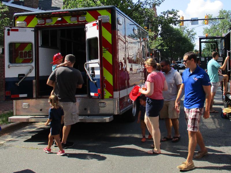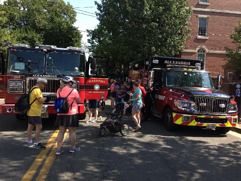 Festival-goers look at a City of Alexandria fire truck and ambulance parked outside of the museum, 2019.