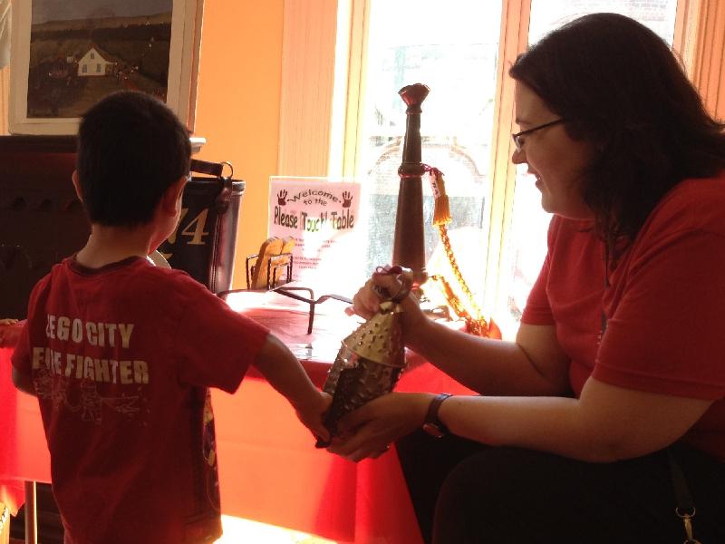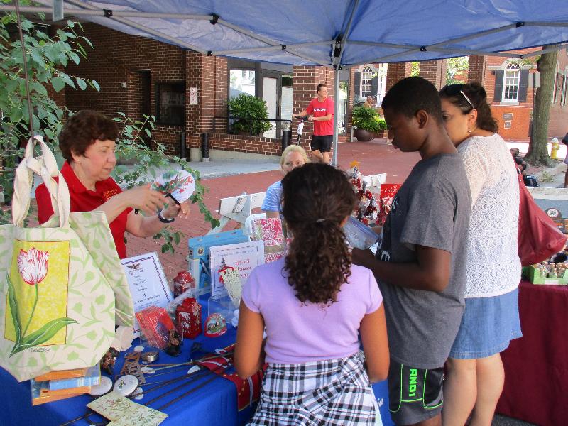 A family looks at items for sale at the Office of Historic Alexandria shop table.
