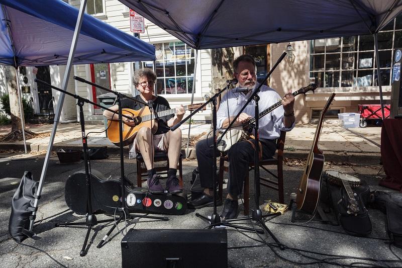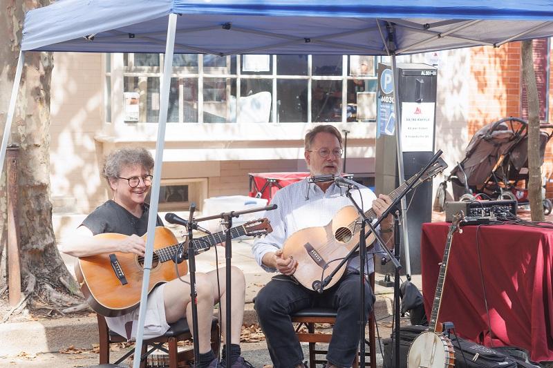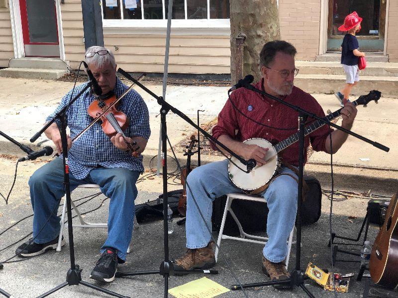 Two musicians play a fiddle and a banjo on the street at the Friendship Festival.