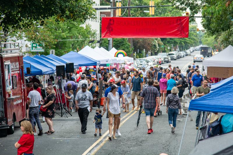 Adults and children walk in the middle of the street between vendor tents at the Friendship Firehouse Festival.