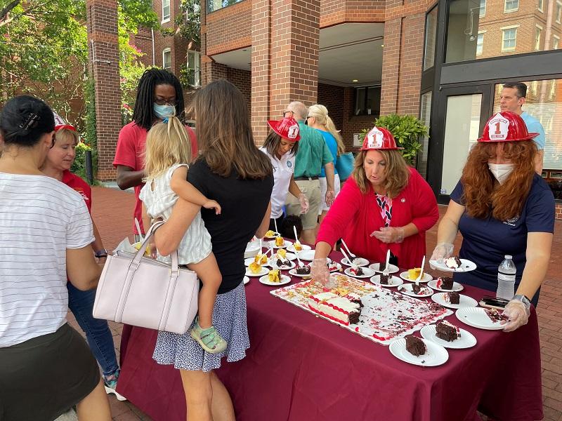 City of Alexandria officials cut a cake at the 2019 festival. From left to right: Acting Fire Chief Corey A. Smedley, Councilmember Amy Jackson, Councilmember Redella S. "Del" Pepper, Mayor Justin M. Wilson.