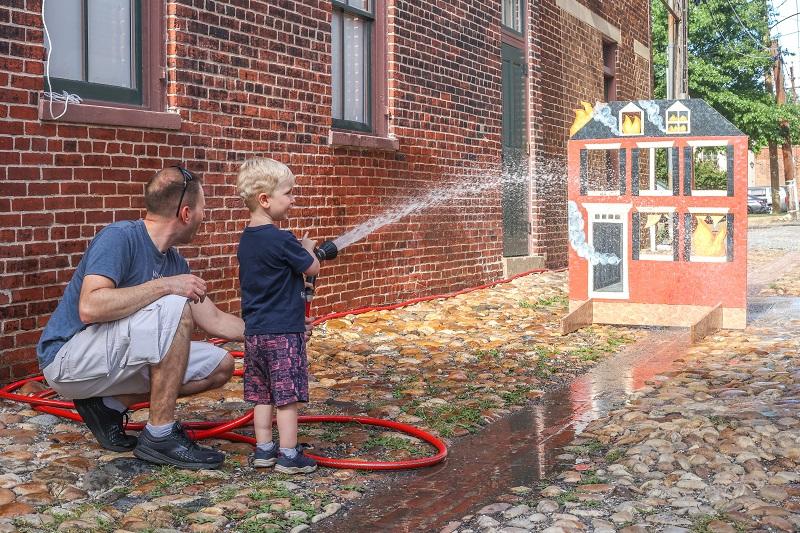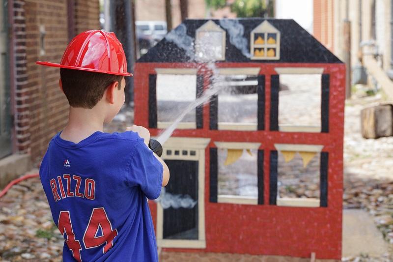 A child uses a hose to “extinguish” pretend flames painted on a miniature plywood house.