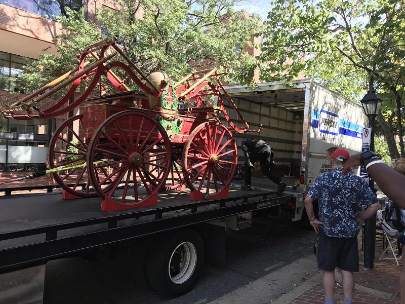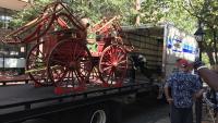 The pumper is being moved onto a truck for its journey to Pennsylvania for conservation
