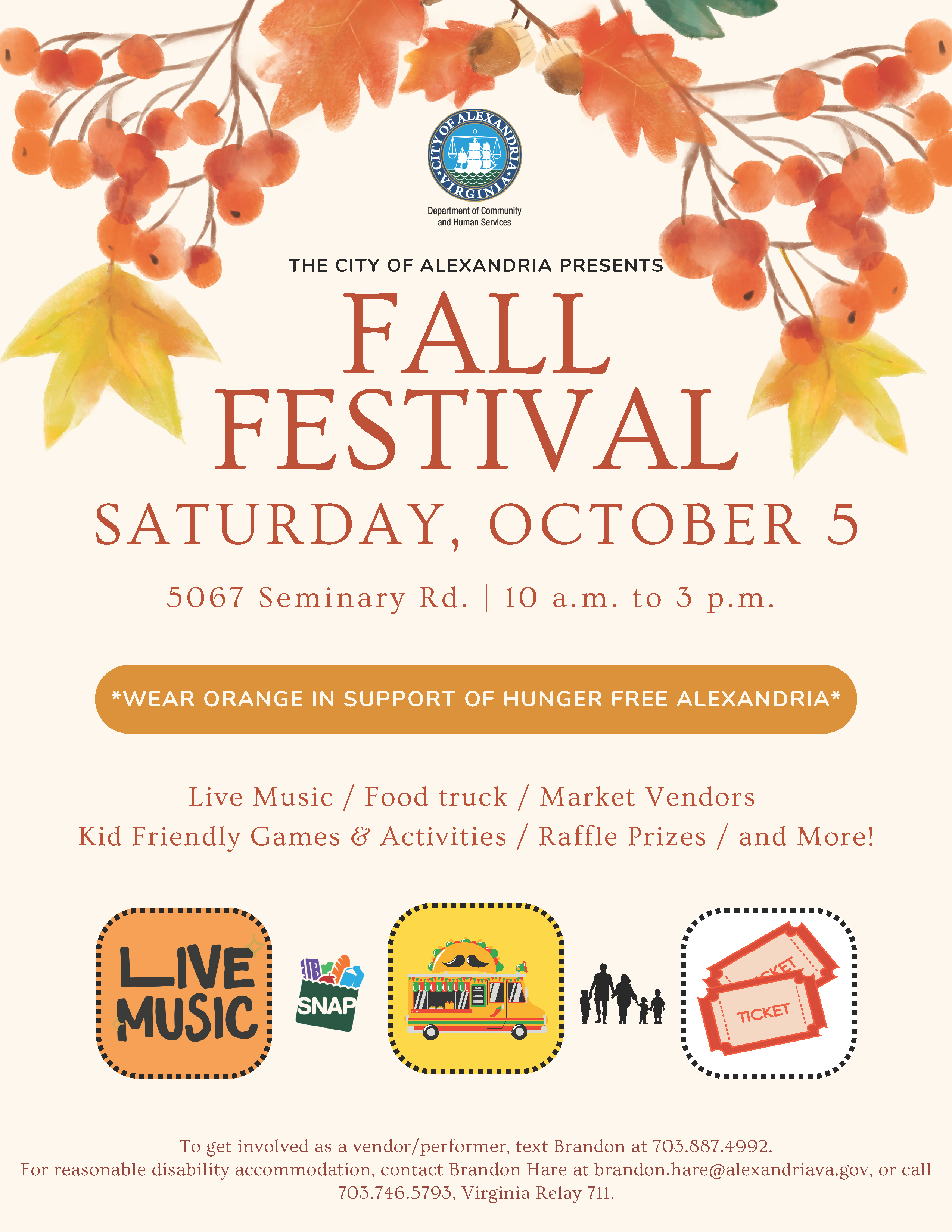 ALEXANDRIA, VA — The City of Alexandria’s Department of Community and Human Services invites the community to its annual Fall Festival on Saturday, October 5, from 10 a.m. to 3 p.m. at 5067 Seminary Rd. This fun-filled event promises a day of entertainment and community spirit with live music, a variety of food trucks, and several market vendors.