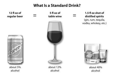 The amount of liquid in a glass, can or bottle does not always match up with how much alcohol is in a drink. In the United States, a standard drink contains about 0.6 fluid ounces, or 14 grams, of pure alcohol. Even though they come in different sizes, the drinks pictured below are examples of one standard drink and each contain approximately the same amount of alcohol.