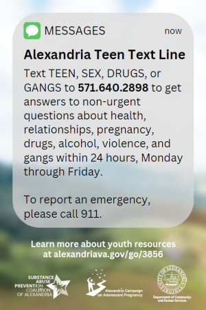 The Alexandria Teen Text Line allows Alexandria teens to text the words TEEN, SEX, DRUGS, or GANGS to 571.640.2898 to get answers to non-urgent questions about health, relationships, pregnancy, drugs, alcohol, violence, and gangs. Trained City staff will answer teens' questions within 24 hours, Monday through Friday.