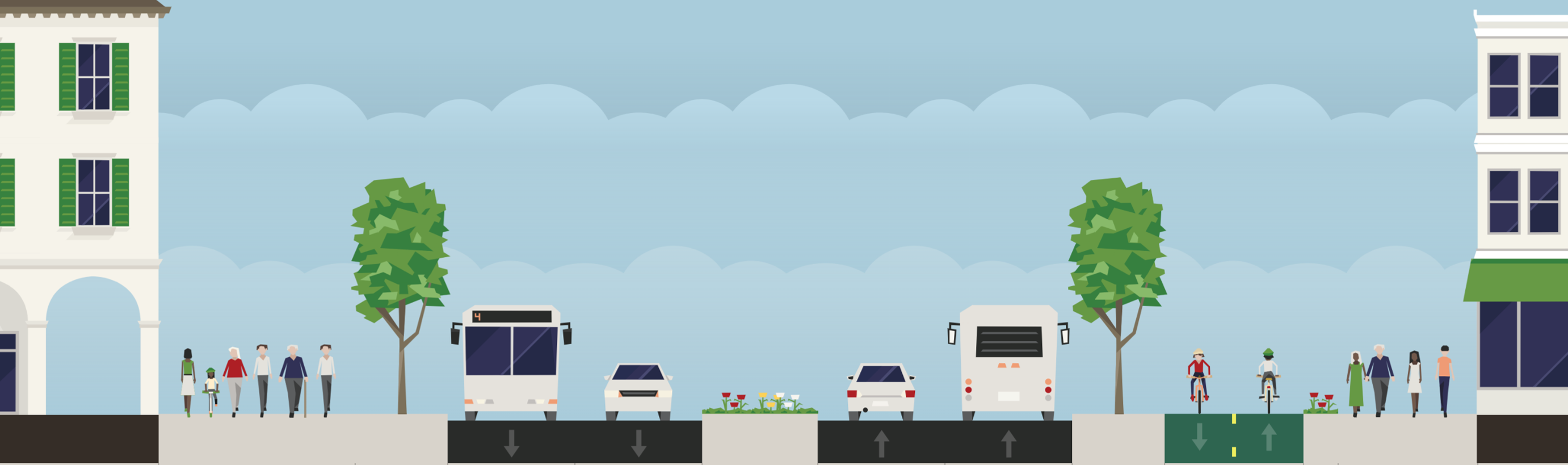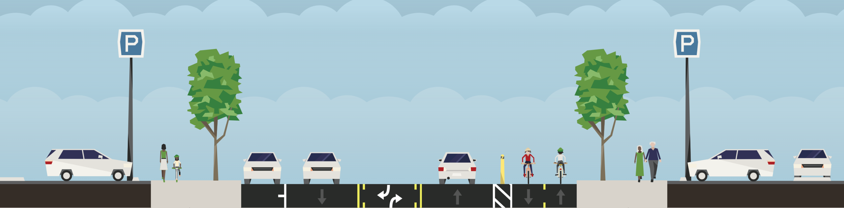 - Remove one travel lane in each direction to slow vehicle speeds, create more space for other important roadway features, and increase safety for all road users.