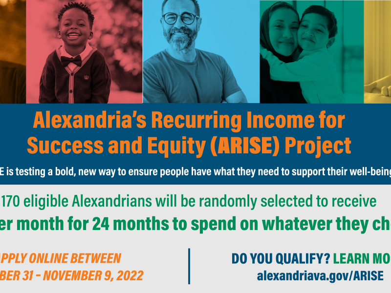 Alexandria Recurring Income for Success and Equity (ARISE) is the City of Alexandria’s guaranteed income pilot study. ARISE provides a $500.00 monthly payment to 170 randomly selected participants for 24 months. Learn more and find the answers to frequently asked questions.