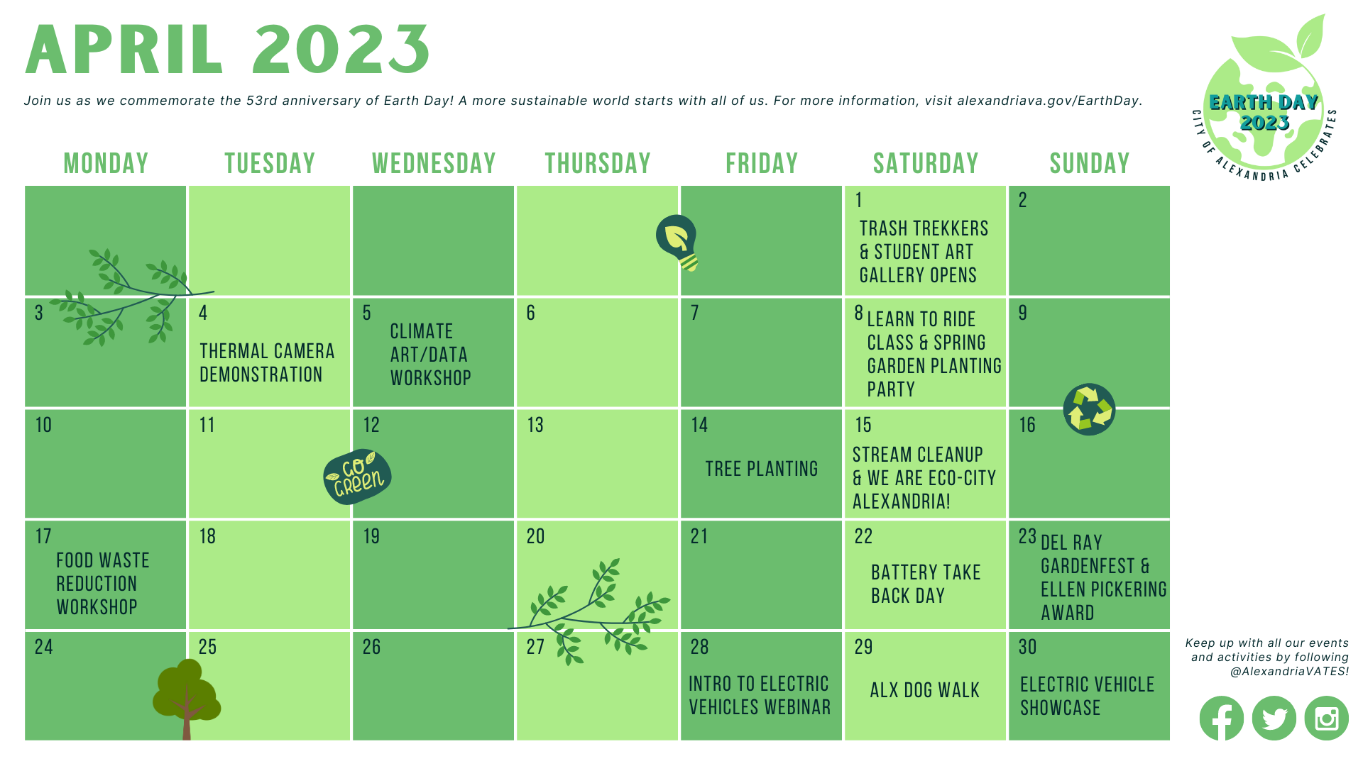 In April 2025, let's celebrate and recognize Earth Day as we take “Steps to a Greener Alexandria.” Each week of Earth Month focuses on our Eco-City principles and initiatives as we celebrate a month focused on Transportation, Water Resources, Energy & Climate Mitigation, Air & Land, and Solid Waste.