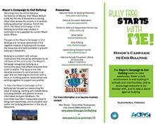 A proclamation announced the start of the Mayor's Campaign to End Bullying in Alexandria in 2014. The purpose of the campaign, sponsored by the U.S. Conference of Mayors, is to wipe out bullying in our nation's schools and communities. Alexandria has joined more than 170 jurisdictions from around the country who have signed on to the campaign to raise awareness, foster a safe school climate, end bullying in schools and communities, and encourage everyone to take a stand against bullying.