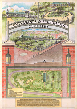 The Contrabands and Freedmen Cemetery Memorial in Alexandria, Virginia, is a sacred site dedicated to honoring more than 1,700 people of African descent buried here during and immediately following the Civil War. A solemn and reverent place, the memorial offers opportunities for reflection, commemoration, education, and the search for cultural identity. Through reclamation of this nearly forgotten burial ground and preservation of the hundreds of graves that have survived, we pay tribute to the dignity and courage of Alexandria's freed men, women, and children. We not only remember their story, but also our own history as a community and a nation. The memorial stands as a reminder to generations that the struggle for freedom and equality and the people who fought for it cannot, and will not, be forgotten.