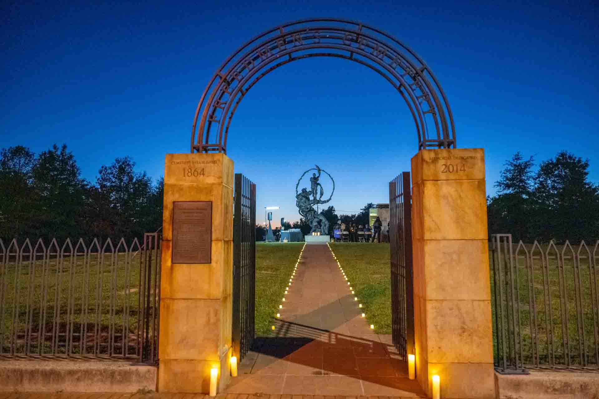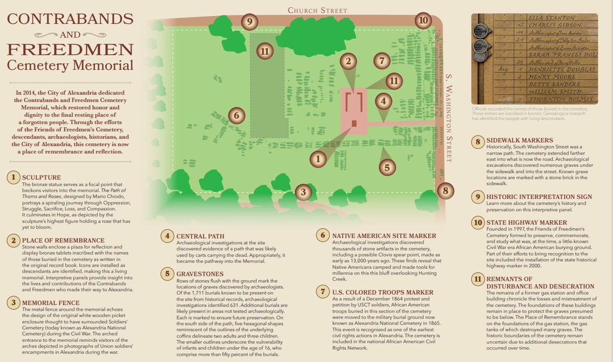 Alexandria Contrabands & Freedmen Cemetery served as the burial place for about 1,800 African Americans who fled to Alexandria to escape from bondage during the Civil War. A Memorial opened in 2014 on the site of the cemetery, to honor the memory of the Freedmen, the hardships they faced, and their contributions to the City.