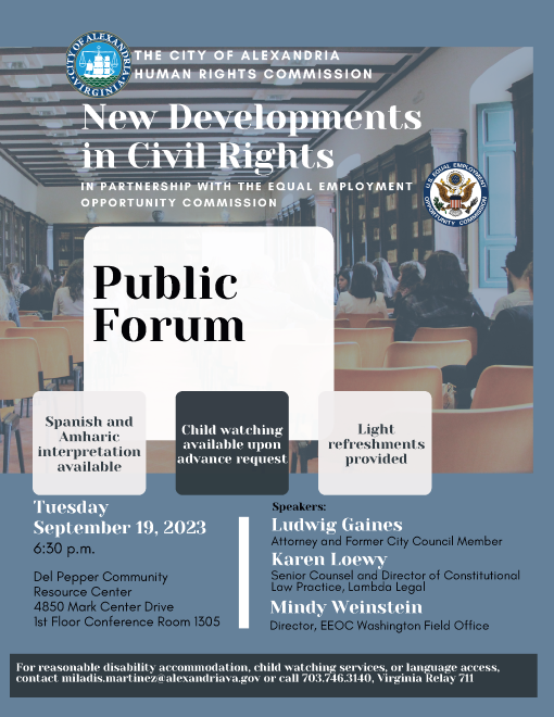 The Alexandria Office of Human Rights was established to combat discrimination, increase equal opportunity and protect human rights for persons who live, work, or visit in Alexandria.