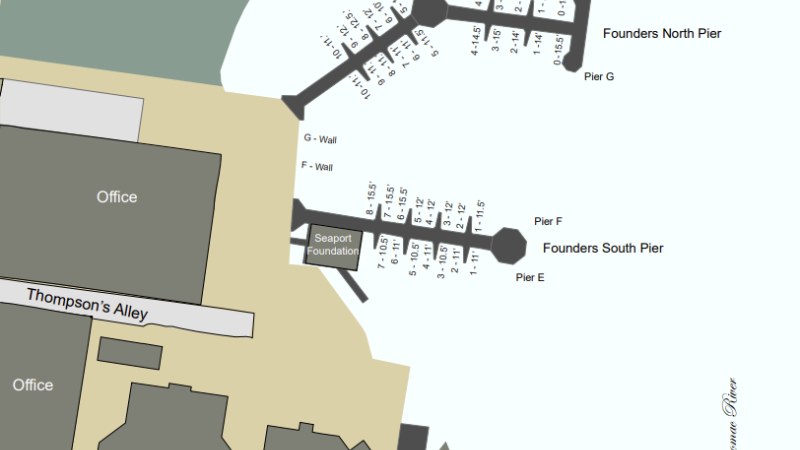 - The east end of the Founder's Park North Pier can accommodate vessels up to 220 feet long. Please call for information regarding electric availability. Water is available in season.