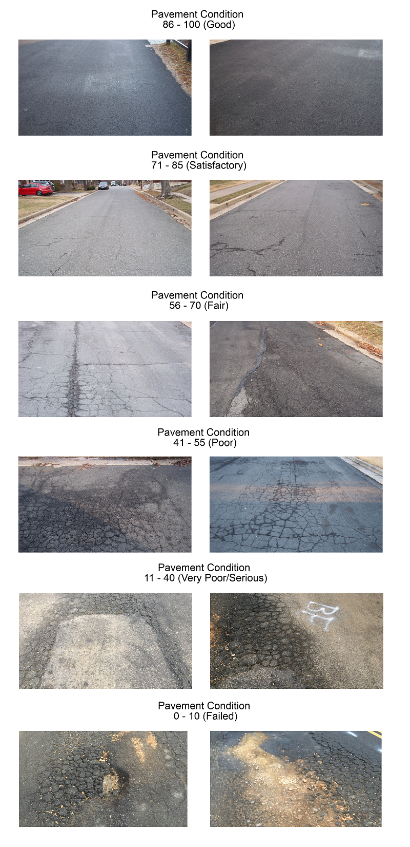 12 showing the various stages of pavement condition, from new to failed/crumbling