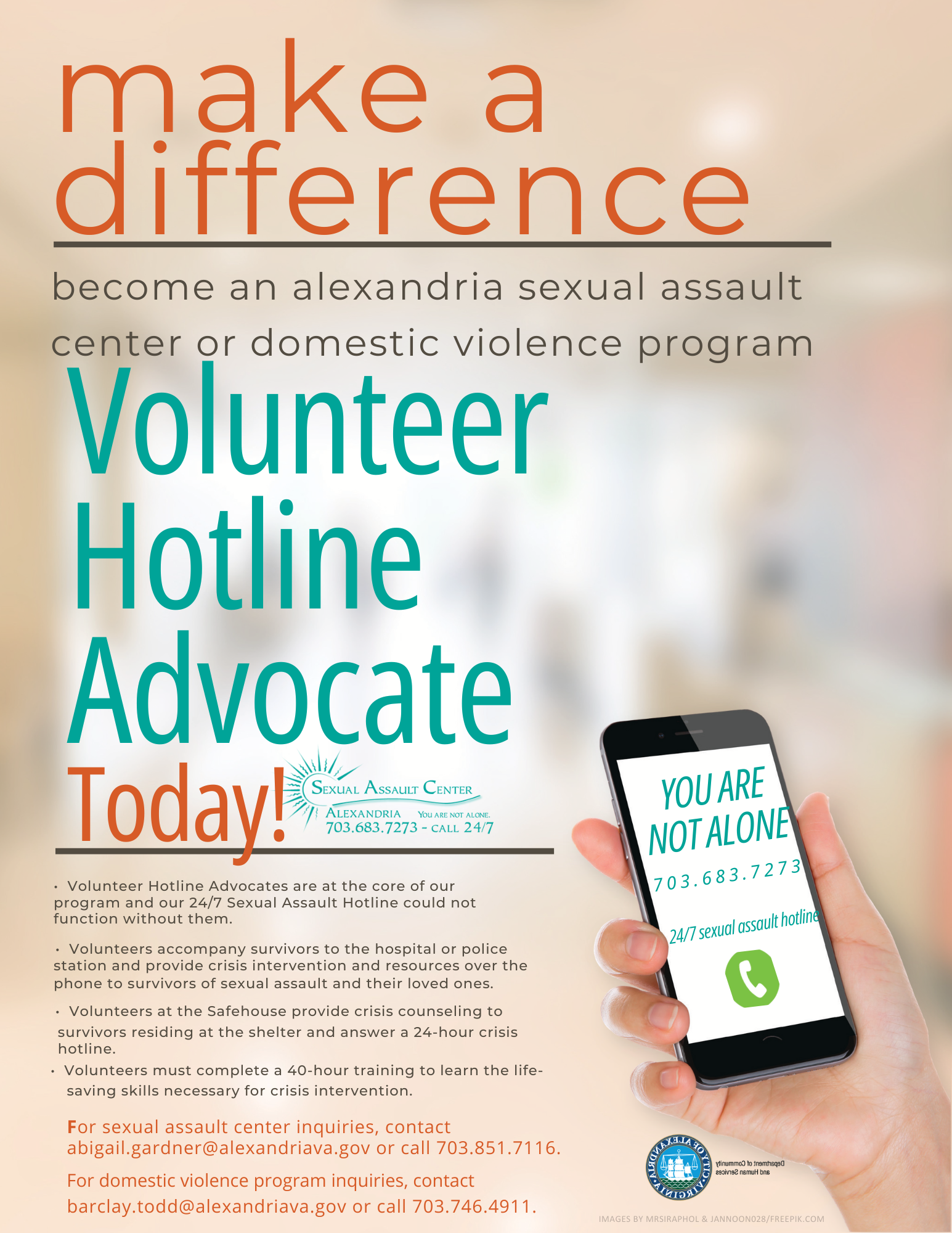 Alexandria's Sexual Assault Center and Domestic Violence Program need your help! Be a volunteer hotline advocate! Volunteers accompany survivors to the hospital or police station and provide crisis intervention and resources over the phone to survivors of sexual assault and their loved ones and more. Check out the flyer for more information. For sexual assault center inquiries, call 703.746.3122. For domestic violence program inquiries, call 703.746.3647.