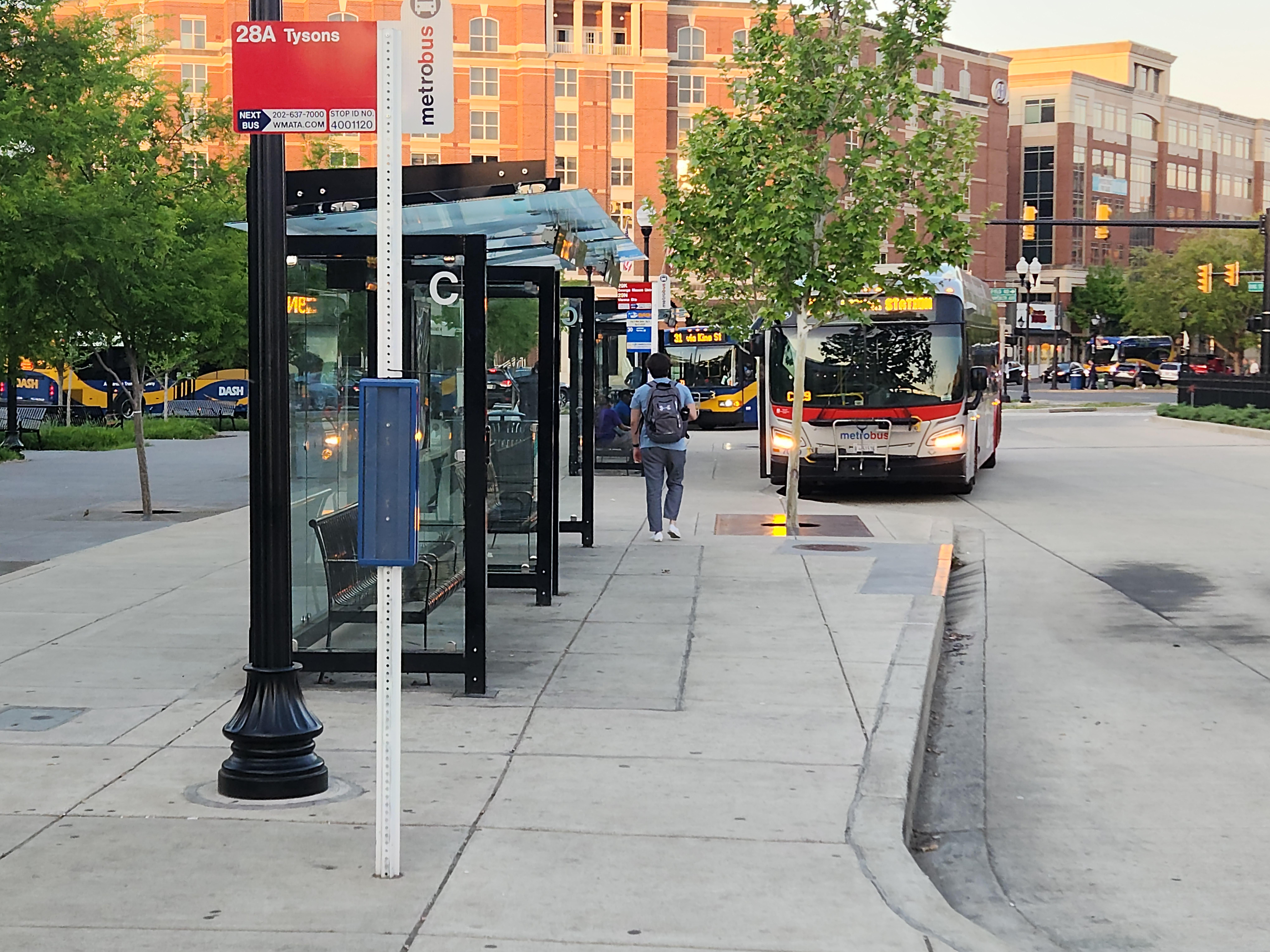 The Mark Center Transit Center, created in 2011 to serve new federal employees from the BRAC realignment, features 6 bus stops serving 19 different bus routes, including local DASH to WMATA to commuter buses and private shuttles. More than 1,100 passengers use this facility on a normal (pre-COVID) weekday. Currently, City & DASH staff are working with property owners to expand the existing transit center as part of the redevelopment of an adjacent parcel.
