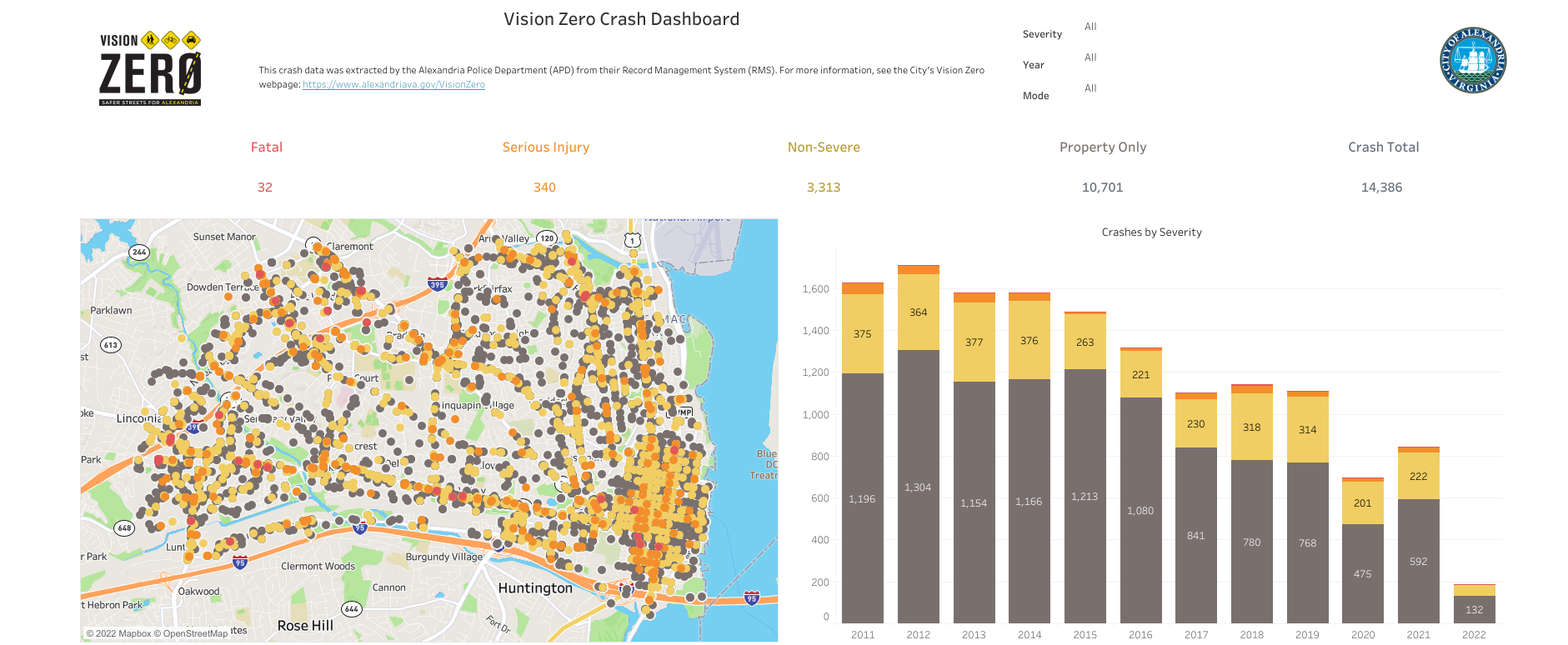 The Vision Zero Crash Dashboard provides citywide traffic safety data to the public. This dashboard is for exploration purposes. Data may not appear in the dashboard until two months after a crash while the crash report is finalized. This dashboard includes crashes that occurred in Alexandria and were reported to police - crashes involving injuries, deaths, or at least $1,500 in damages.