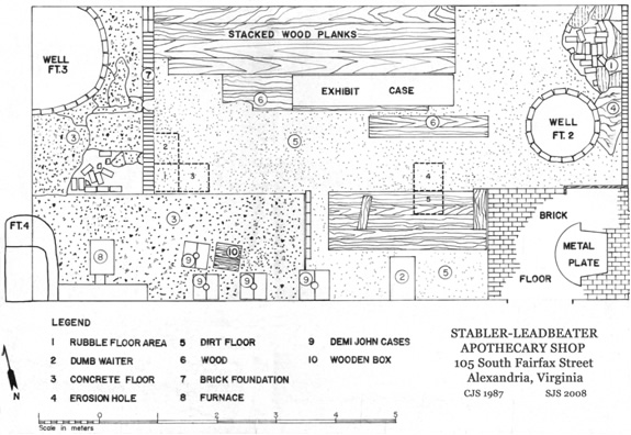 The cellar of the Apothecary shop consisted of packed earth, with areas of wooden planking. A one-meter and five half-meter square test pits were excavated in the dirt floor. More than 2,000 artifacts were recovered. At 105 South Fairfax Street there were over 1,000 fragments of window glass and numerous nails, screws, wires, nuts and bolts, and general structure debris that one would expect in a cellar. Other artifacts included an eyedropper, two marbles, buttons, a brush handle, part of a hacksaw, corks, two pills and some crystalline chemical substances. In addition, over 200 animal bone fragments were found, along with numerous fragments of bottle glass and ceramic sherds.