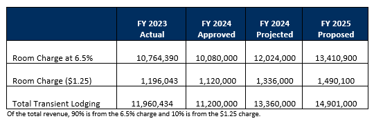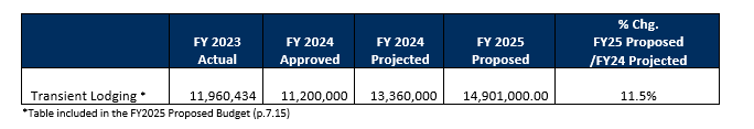 The transient lodging tax rate was last increased in FY 2019 from 6.5 percent of the room charge and $1.00 per room per night to 6.5 percent of the room charge and $1.25 per room per night. In FY 2023, the City collected $12.0 million in transient lodging revenue from both sources and is projected to collect $13.4 million in FY 2024. Based on the FY 2023 revenue, raising the local base tax rate to 7.5 percent would generate $2.0 in additional revenue. There is no State limit on transient lodging tax for cities and the FY 2025 proposed budget recommends no change to this rate. There were no revenue enhancements other than property tax increases suggested by staff.