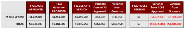 As noted in the chart below, based on current “versions” of the State budget, there are varying potential fiscal impacts. Depending on the final compromised and approved budget, ACPS will make the appropriate budgetary adjustments. See below: