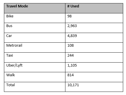 Below is data about the visitors to the Department of Community and Human Services (DCHS) Center for Economic Supports 5th floor lobby from January 1st to March 23rd, 2024. This provides a snapshot of the methods visitors, who are accessing Public Benefits and Housing Supports, are using to access the Del Pepper Center. This information is gathered through a kiosk sign-in system that will be expanded to other parts of DCHS in the coming months.