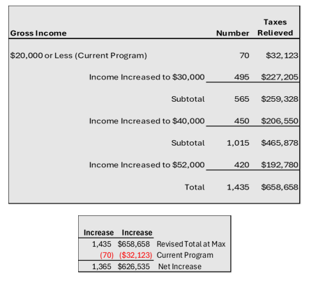 Extrapolating from American Community Survey data (Census), it can be roughly estimated that raising the gross income limit could further reduce General Fund revenue as follows: