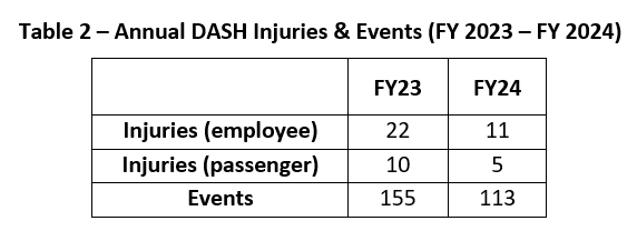 The following table provides a summary of the total number of injuries and events involving DASH vehicles in the last two fiscal years. Events can include minor contacts with immovable objects such as tree branches, curbs and storm drains. The statistics below equate to about one event per every 20,000 miles of service, and one injury for every 100,000 miles of service.