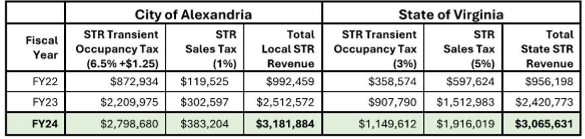 Short-term rentals generate approximately $3.2 million in tax revenue for the City of Alexandria and $3.1 million for the State of Virginia. This represents 25% of Transient Occupancy Taxes (TOT) generated in the city.