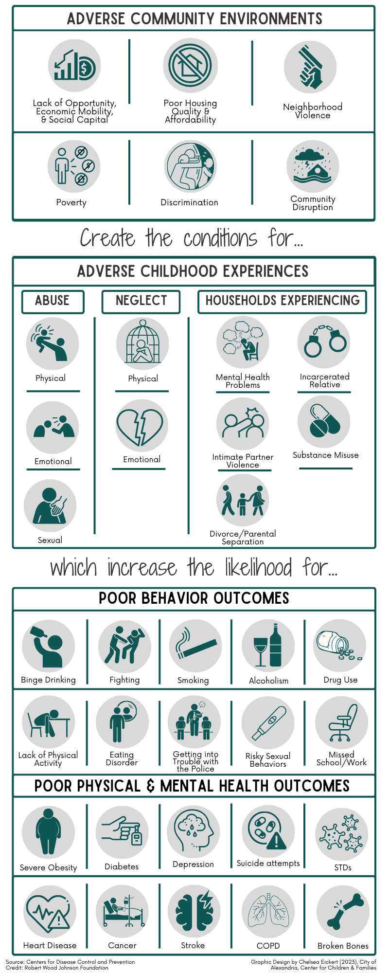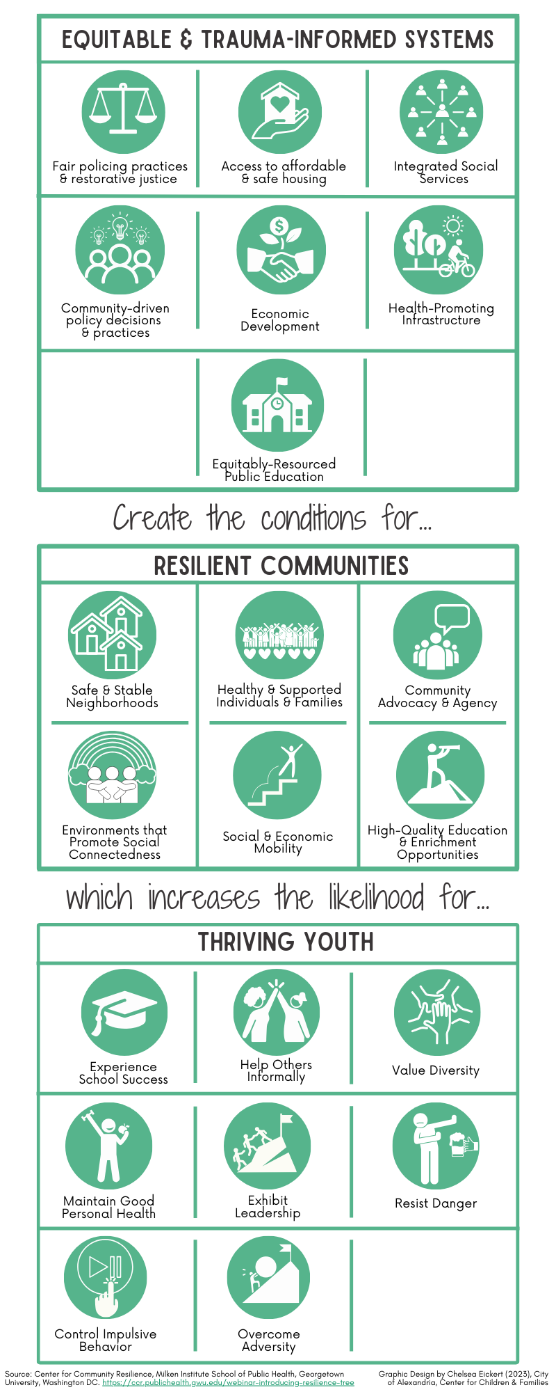 In 2021, Alexandria celebrated the release of its second Children and Youth Community Plan (CYCP), a blueprint for improving outcomes for children who call Alexandria home. Every month, the City’s Department of Community and Human Services publishes a “Children and Youth Community Plan Report Card” that engages the public on the progress of the CYCP. Each Report Card helps tell the unique story about Alexandria’s children and youth. RAISE coordinates the Plan's strategy to "Create a more trauma-informed and resilient Alexandria by informing, supporting, and elevating our community." View the PDF version of the 2024 Report Card on Community Resilience.