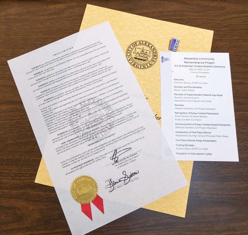 At the same event, Mayor Justin Wilson, members of City Council, and ACPS School Board Members celebrated the 40 Alexandria City High School students who have worked with ACRP to acknowledge and remember Alexandria lynching victims Joseph McCoy (April 23, 1897) and Benjamin Thomas (August 8, 1899) with a citywide proclamation.