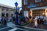 From August 6-9, 2021, Alexandria City Hall and the Carlyle House (shown here) and the George Washington Masonic Memorial are illuminated in purple, the color of morning.