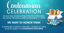 Aging and Adult Services, in collaboration with the Successful Aging Committee, celebrated National Centenarian Day by recognizing the experiences and achievements of Alexandrians who have lived a century or longer. A presentation at City Hall honored the residents who would be 100 years old or older by the end of the year. They were among more than 100,000 centenarians in the U.S.