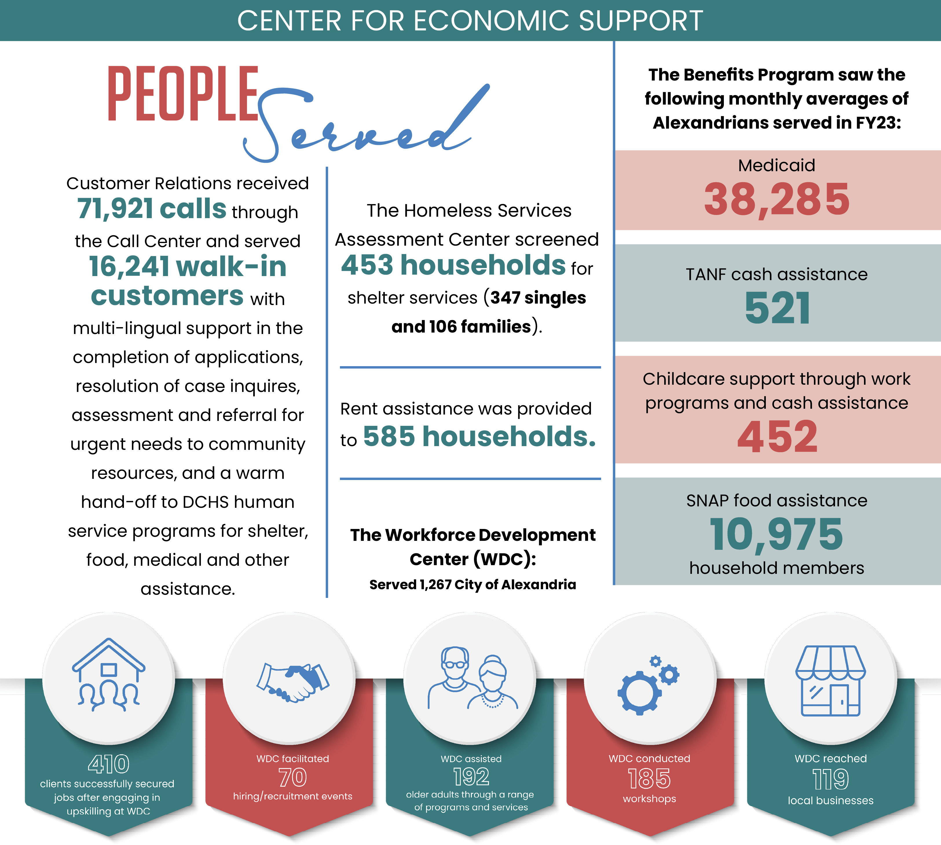 The Center for Economic Support guides Alexandrians in accessing a range of human service programs and benefits, works to reduce homelessness and prevent evictions, operationalizes strategies to address food scarcity and helps people obtain training and employment.
