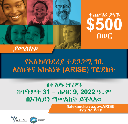 Alexandria's Recurring Income for Success and Equity (ARISE) is a guaranteed income pilot study that began in January 2023. ARISE provides a $500.00 monthly payment to 170 randomly selected participants for 24 months with “no strings attached,” giving participants freedom to choose how to spend the money.