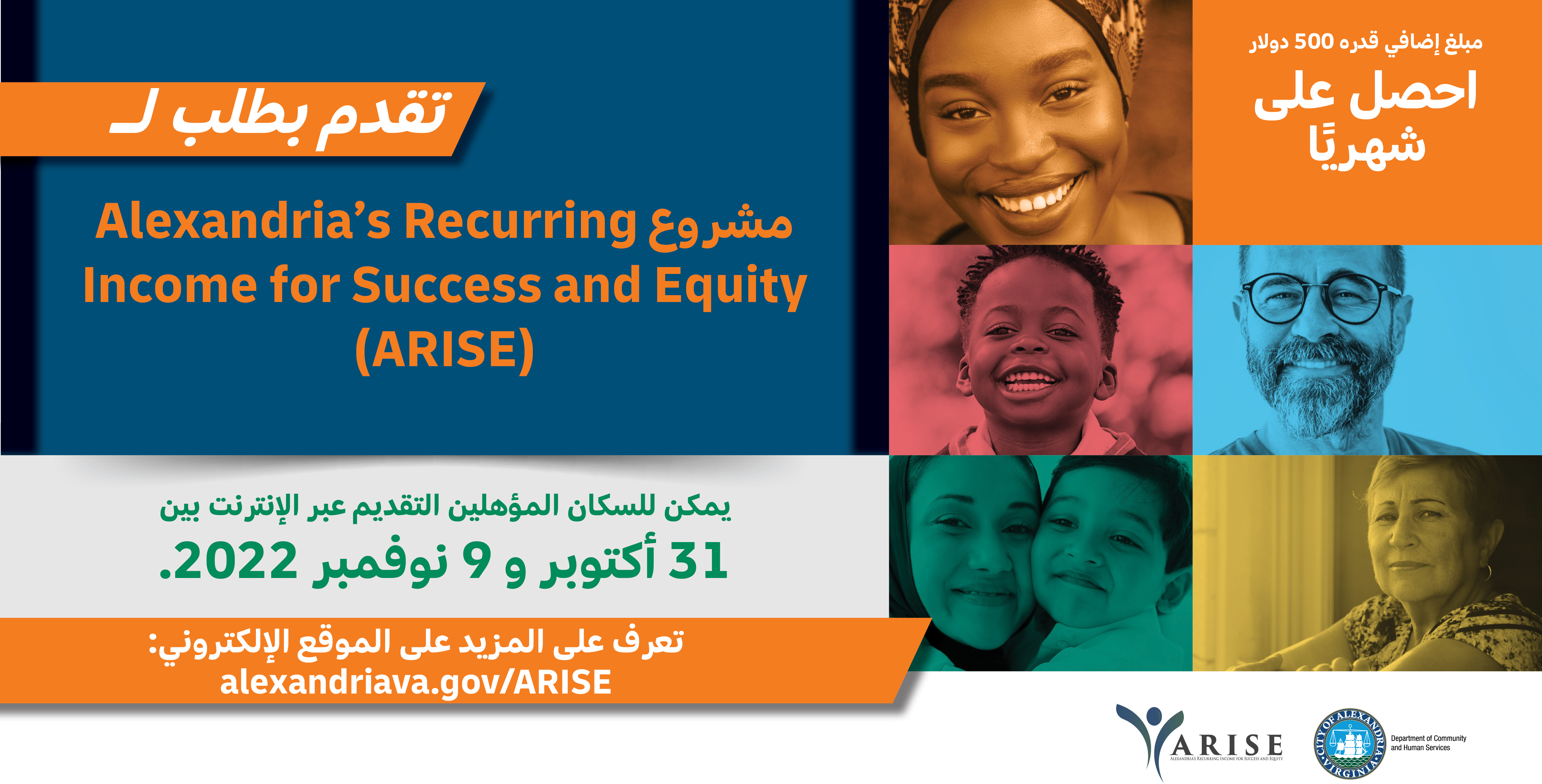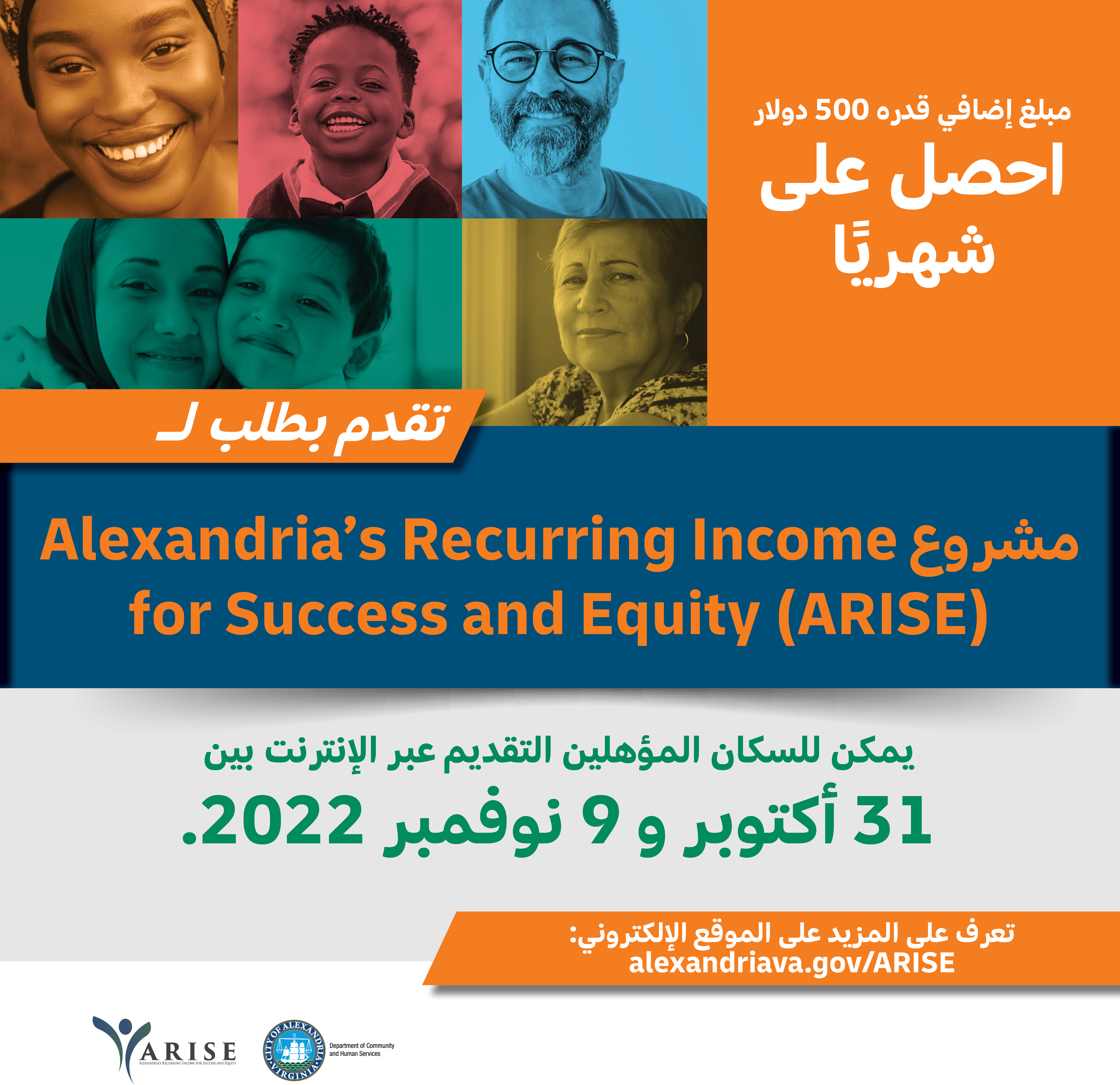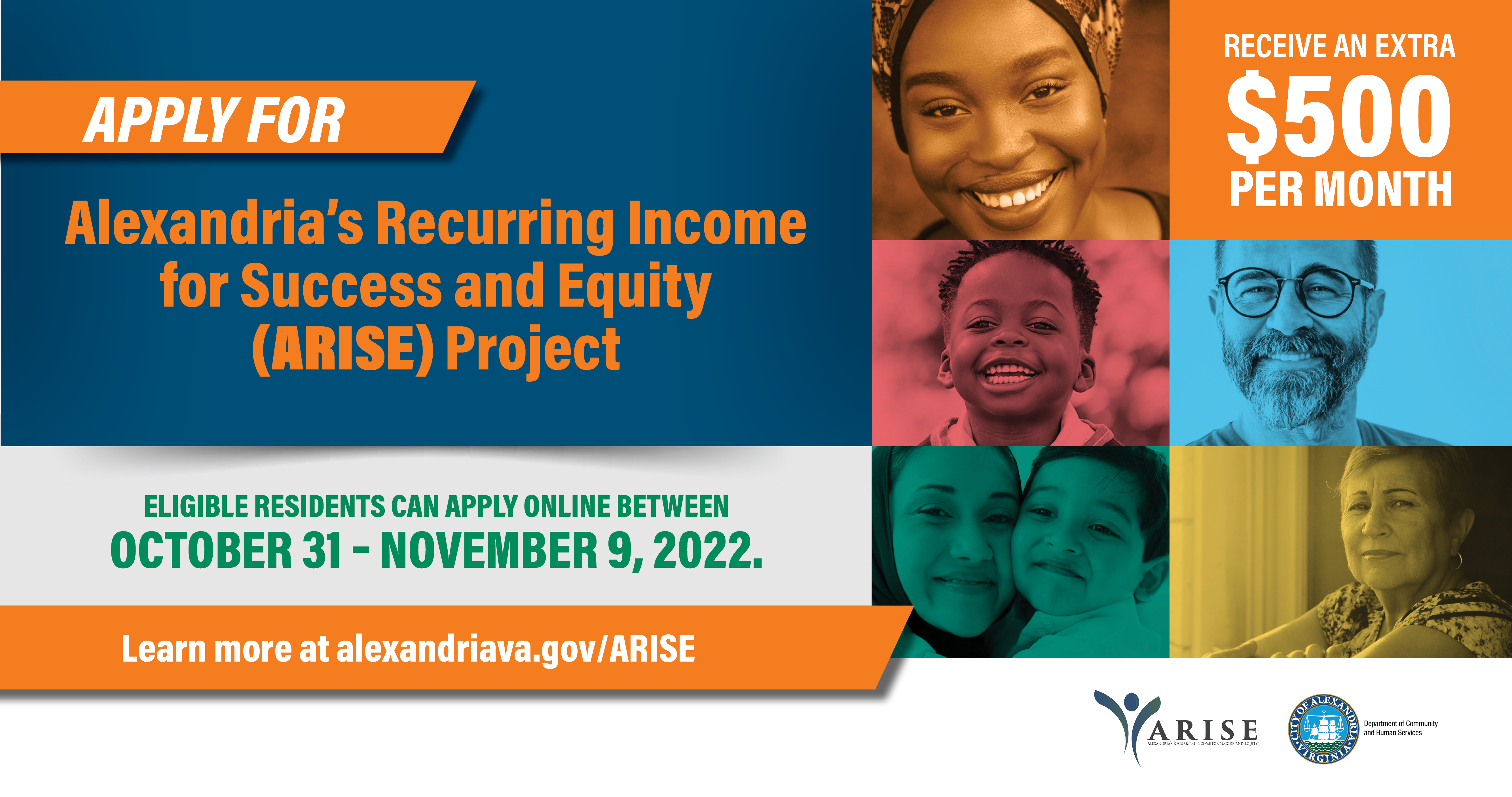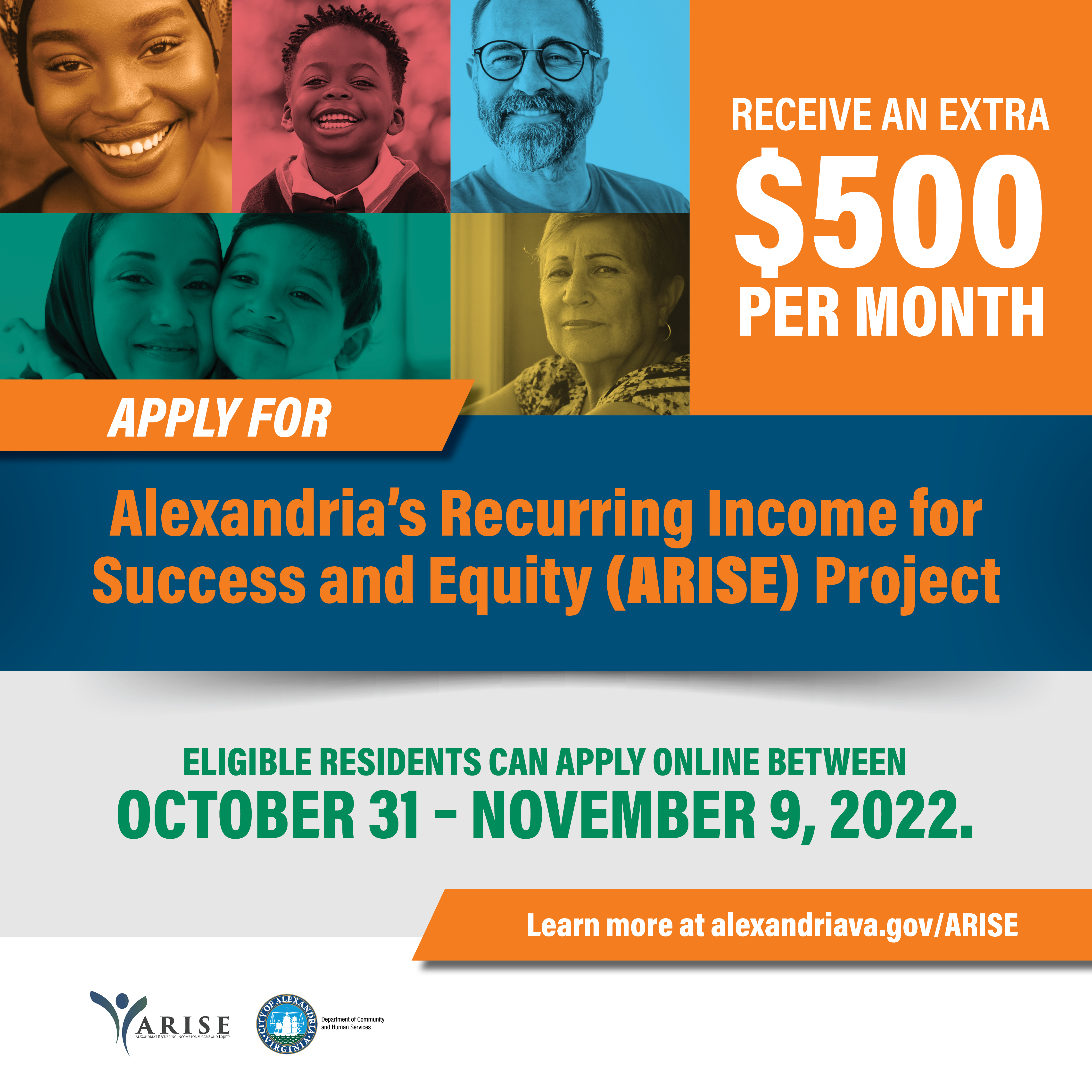 Guaranteed Income Pilot :: The application period for Alexandria’s Recurring Income for Success and Equity’s (ARISE) Guaranteed Income Pilot is now open until November 9! Eligible residents can apply to receive an unconditional payment of $500 a month for two years with no requirements and no restrictions. Learn more and apply today at alexandriava.gov/ARISE. #ARISEALEX #GuaranteedIncome #ACTforAlexandria #AlexandriaVA #NorthernVA #NoVA - Twitter