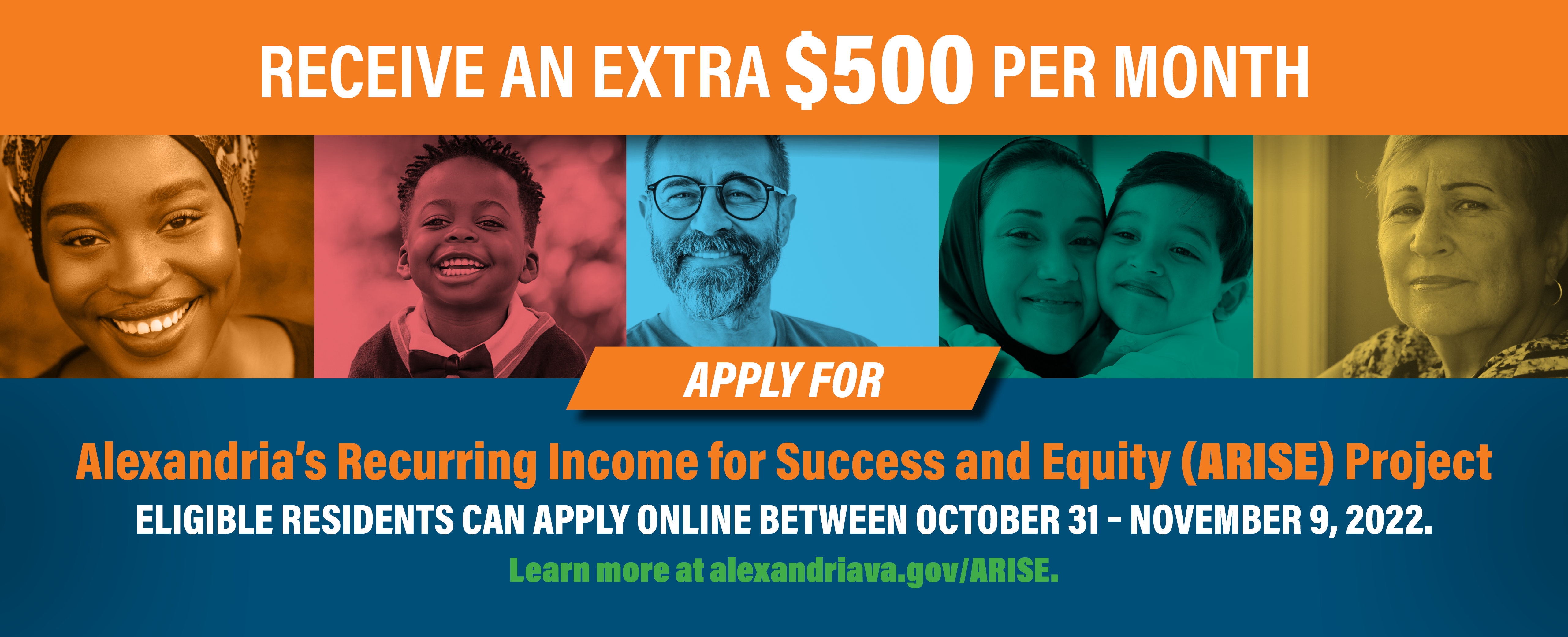 Guaranteed Income Pilot :: The Application period for Alexandria’s Recurring Income for Success and Equity’s (ARISE) Guaranteed Income Pilot is almost here! Eligible residents can apply to receive an unconditional payment of $500 a month for two years to spend with no requirements and no restrictions. Application period is October 31–November 9. Learn more at alexandriava.gov/ARISE. #ARISEALEX #GuaranteedIncome #ACTforAlexandria #AlexandriaVA #NorthernVA #NoVA - Twitter