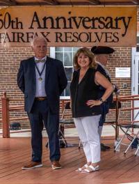 Podium and 25th Anniversary Fairfax Resolves banner, in front of City Hall