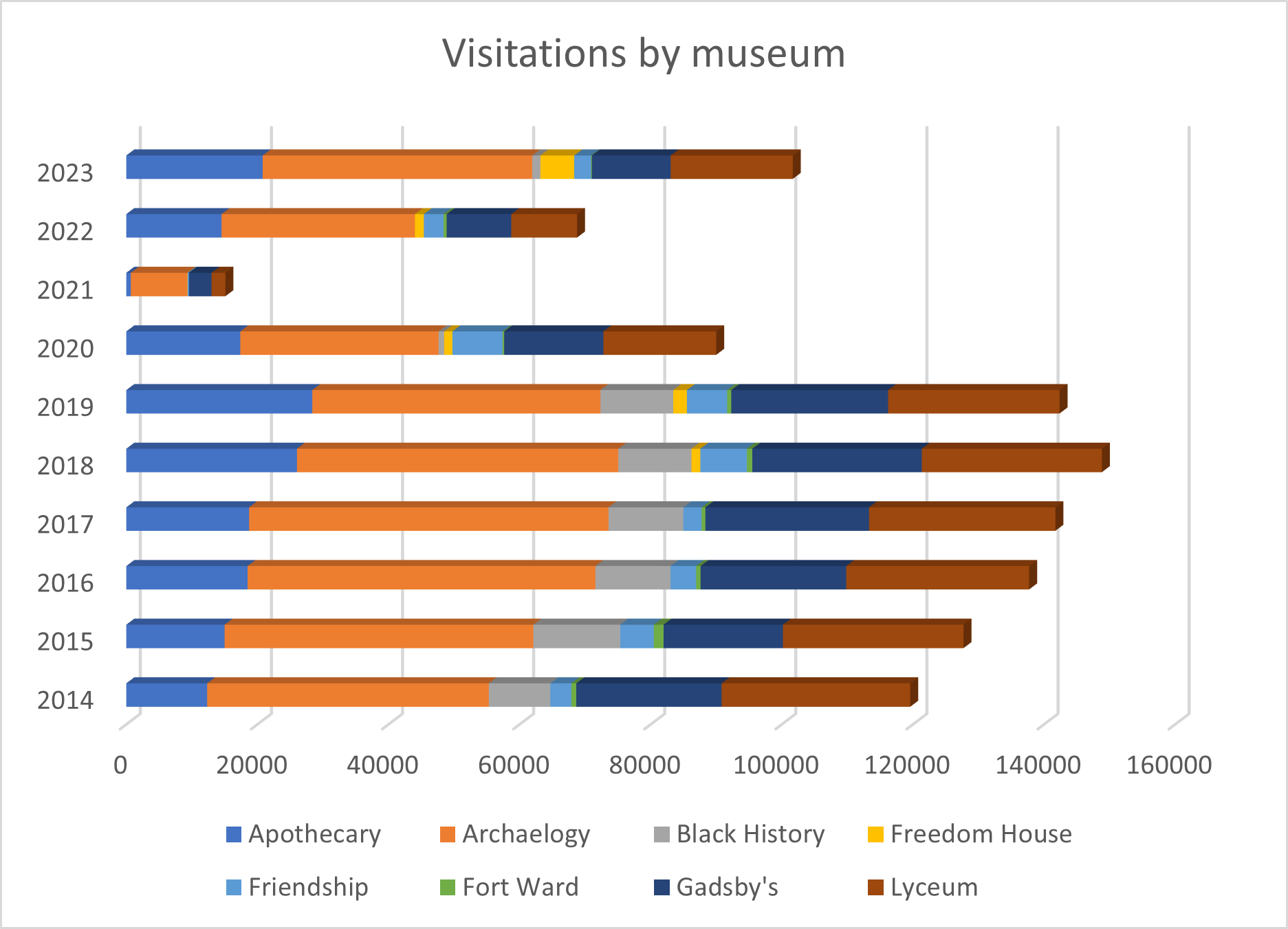 Instill a sense of place As you can see, visits were steadily increasing year after year, with a slight drop in FY 2020 and FY 2021 because of the pandemic. Since we reopened, our visits are starting to rise again. However, due to closing for routine maintenance, we have not had a full year of all 8 museums being open to reflect what our museums' guest counts will be. The data is showing that people are wanting to come to museums again and we fully expect continual growth in FY2024. We have seen increased engagement online and at programs and look forward to welcoming returning and new visitors in the future. Additionally, we are looking forward to welcoming back student groups over the next year which will continue to increase our numbers. |