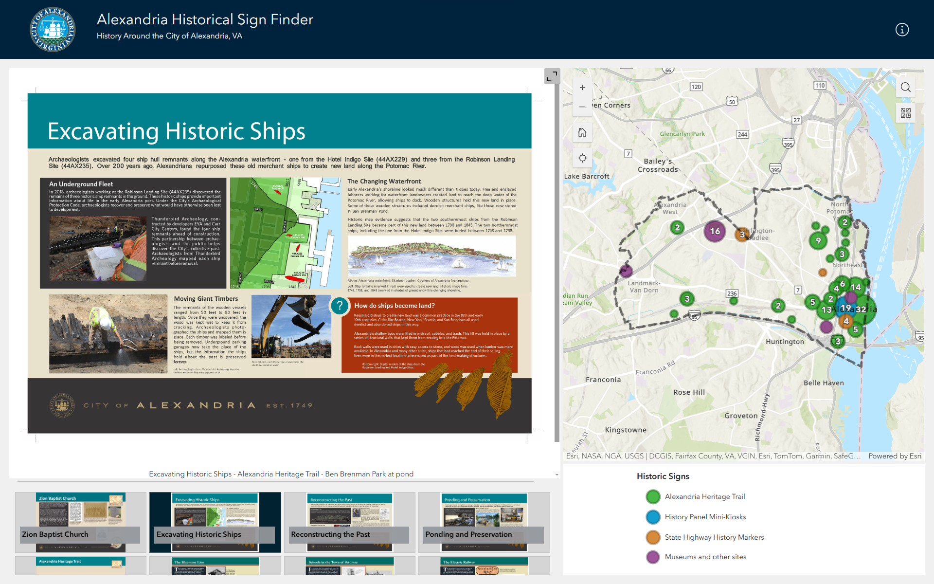 The Alexandria Historical Sign Finder: History Around the City is an interactive map designed for exploring historic interpretation signs throughout the City of Alexandria. The map provides digital access to Alexandria’s heritage as presented on signs. The goal of this interactive map is to make history signs created by or in partnership with the Office of Historic Alexandria easily accessible. Click the point you are interested in and read the sign. This map is meant to be an evolving repository for the research and stories about people and places in the past. As new signs are installed, the map will be updated.