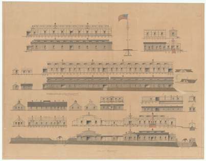 The Quartermaster Map includes a plan and elevation, and a key to the structures. Soldiers Rest includes a dormitory, large kitchen, dining hall, bath house and guard house.