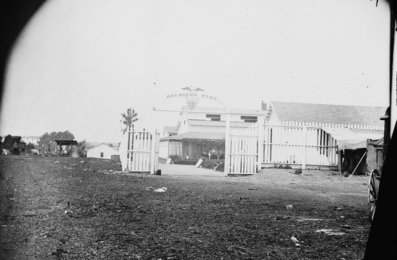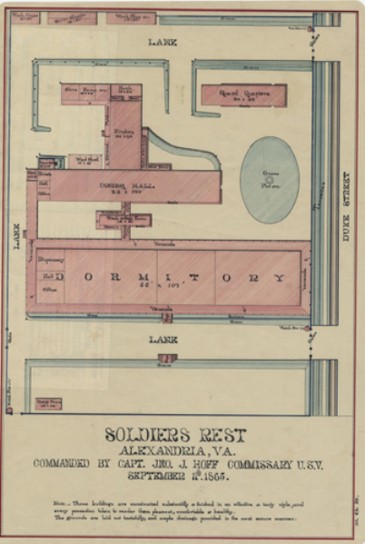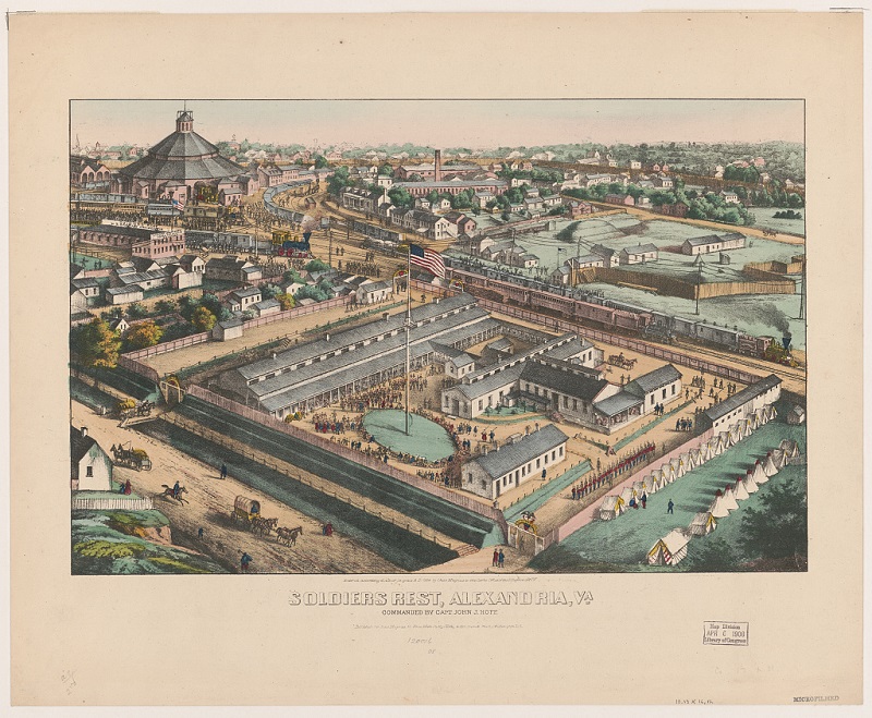 Soldiers Rest was built near the Orange and Alexandria Rail Road Depot to provide a rest for soldiers traveling through Alexandria by train. The complex was used as a hospital from May 28 to October 4, 1864, according to relief worker Julia Wilbur. During that time it was part of the 1st Division General Hospital and then returned to use as a rest stop. (Source: Civil War DC website, from National Archives data.)