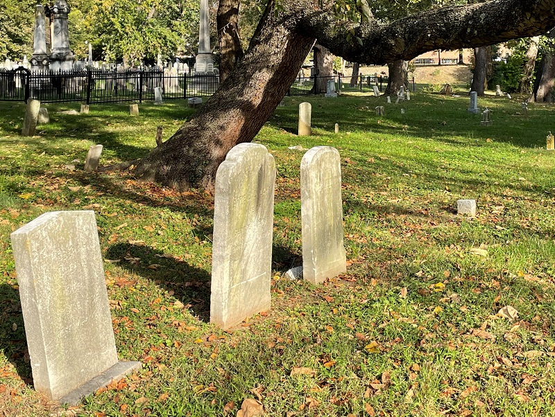 2025 Fall, Gravestone Preservation Update: From October 27 through November 7, gravestone conservator Howard Wellman with Devlin McDonald conserved 23 gravestones on the west side and 3 gravestones on the east side of the cemetery. This part of the cemetery will not be affected by the upcoming stormwater drainage project. The stones that were treated during this round of work were high priority and many needed their original foundations repaired. The determination about which stones need conservation is made as part of the 2022 Douglass Memorial Cemetery Preservation Plan. These 26 grave markers range in age from 1901 to 1971. Two of the stones had sunken to the point where the names could not be read. The conservation documentation for each stone is contained in a report and describes the gravestone’s type and method of construction, condition, and the type of treatment that was undertaken. Before, during, and after treatment photographs were taken. Another round of gravestone conservation will occur in fall 2026.