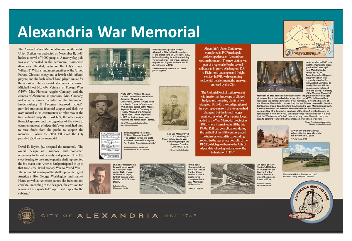 Donated by Mrs. Florence Angelo Cannady; Richmond, VA; Erected in memory of Alexandria War Dead; by Russell Mitchell, Post No. 609; Veterans of Foreign Wars and Citizens of Alexandria; November 11, 1940.